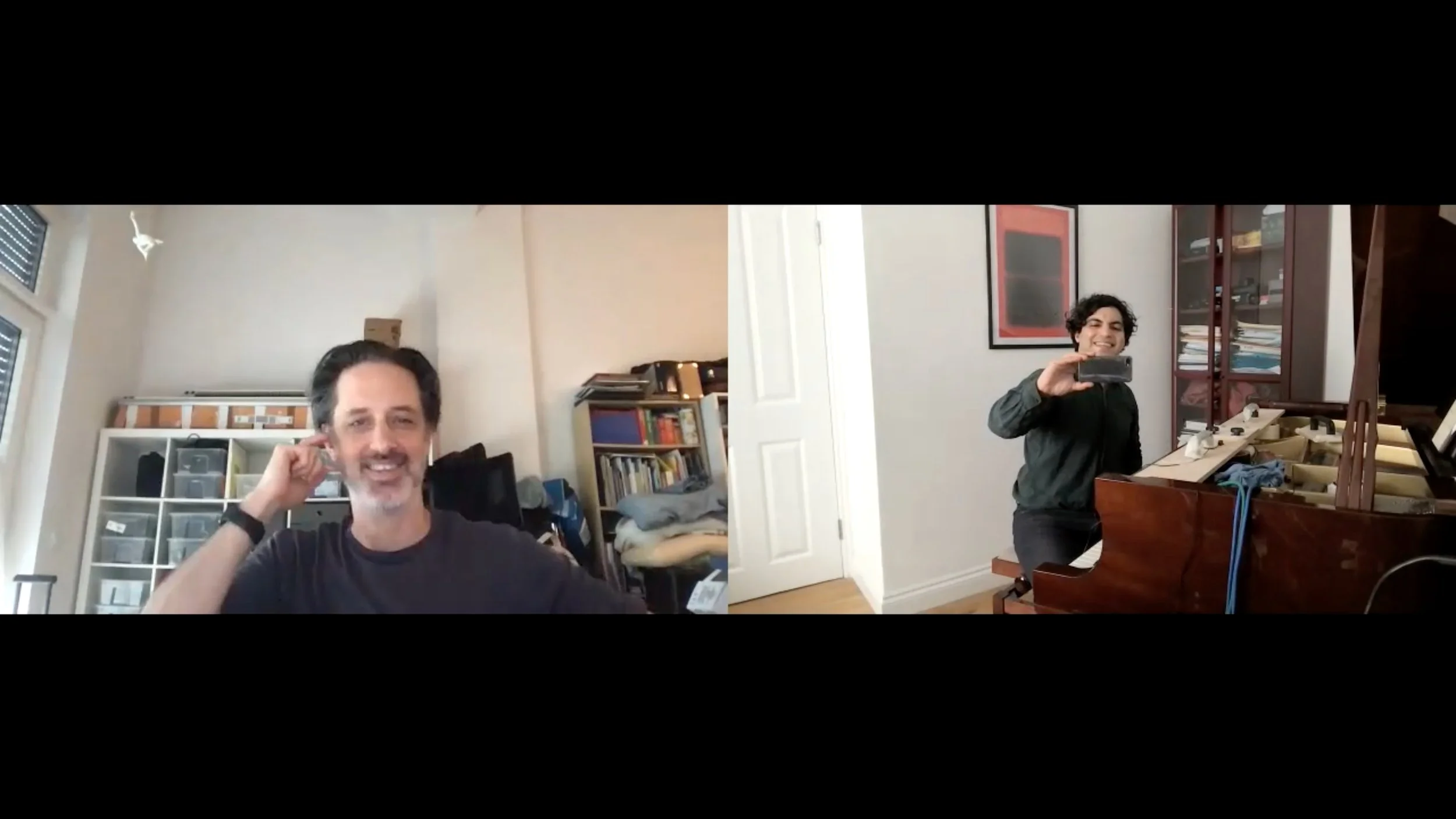 A Zoom rehearsal: Simon Steen-Andersen (left) and Zubin Kanga (right)