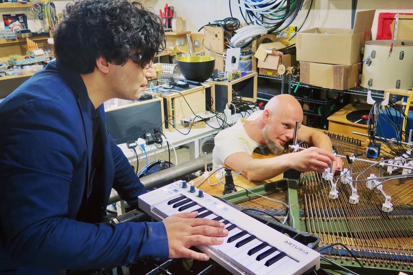 Zubin Kanga working with Sam Underwood to develop a new robotic piano-playing machine