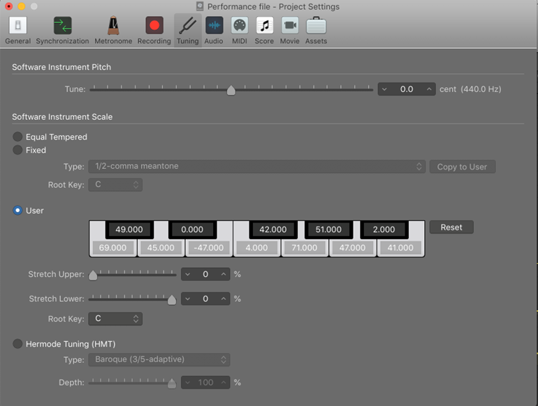 For Aeolian Fantasy, Harry Matthews and I use Logic Pro X as our primary DAW, which allows us to alter the global tuning for a project. This functionality is accessed from the Project Settings menu and lets users retune each of the 12 tempered pitches by a specified number of ‘cents’ (1 cent being 1/100 of a semitone). The limitation with this is that you cannot use more than 12 pitches per octave or use non-octave-repeating scales, and any tuning adjustments are applied to all MIDI instruments in your project.