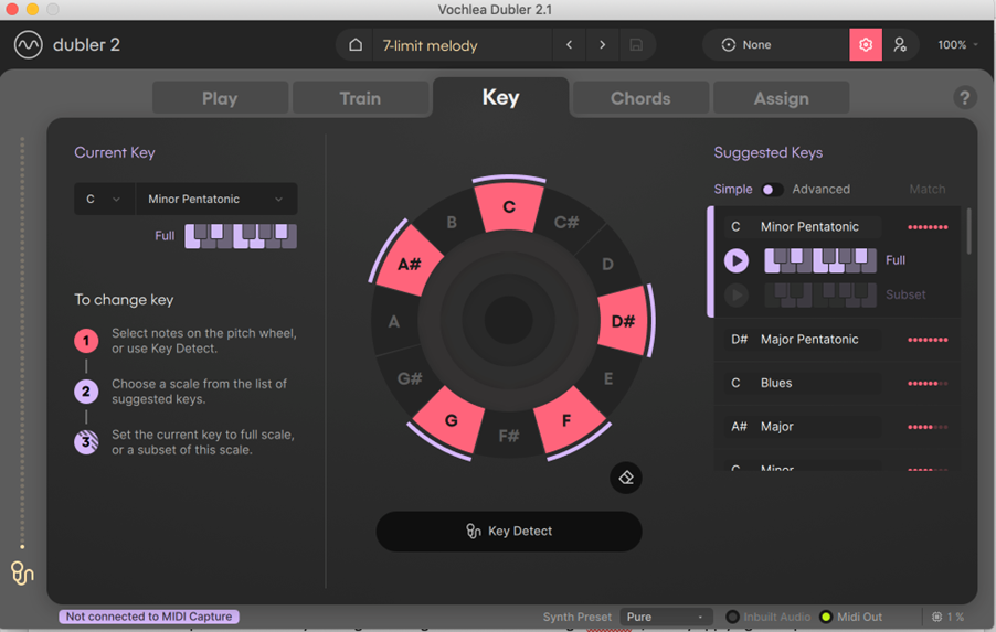 Screenshot of the Key menu in Dubler 2, with a C minor pentatonic scale selected